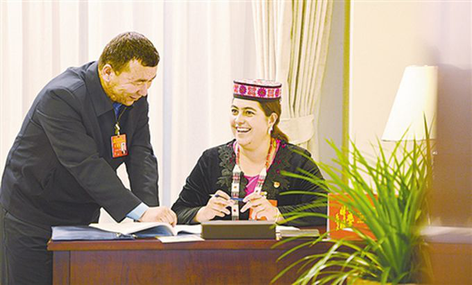 黨的十九大新疆代表團(tuán)駐地里,米日姑麗·艾克米汗和吾布力喀斯木·買吐送代表(維吾爾族)談起五年來(lái)家鄉(xiāng)的巨大變化非常開心,“百姓富了,家鄉(xiāng)美了,來(lái)自全國(guó)的客人也多了” (高興貴 攝影)