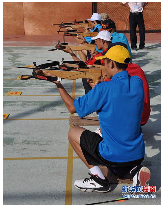 海南省第五屆少數(shù)民族傳統(tǒng)體育運(yùn)動(dòng)會(huì)比賽項(xiàng)目之一——射弩(新華網(wǎng) 圖)