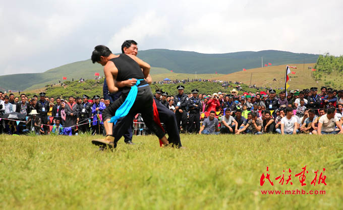 節(jié)日里舉行的彝族式傳統(tǒng)摔跤“格”是全國(guó)少數(shù)民族傳統(tǒng)體育運(yùn)動(dòng)會(huì)的比賽項(xiàng)目,很受彝族群眾喜歡