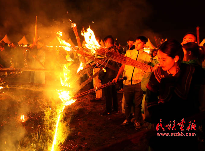 在昭覺(jué)縣谷克德涼山彝族傳統(tǒng)火把節(jié)上點(diǎn)燃火把的人們