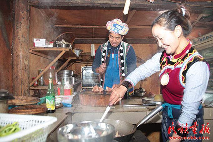 早上,老姆登村73歲的怒族老人斯普早早起來招呼兒子郁伍林、兒媳魯春花:“春節(jié)快放假了,客棧的生意會忙得不可開交,趁著現(xiàn)在客人不多,家里人先吃一頓團(tuán)圓飯吧?!彼蛊绽习樵缒赀^世,7個兒女中老五郁伍林在身邊照顧她?!斑^去在春節(jié)才能吃上一頓好飯菜,也要準(zhǔn)備很長時間,現(xiàn)在每天都有好吃的,天天在過年,多虧了黨的好政策。”說起今天的幸福生活,生在舊社會的斯普感慨萬千。