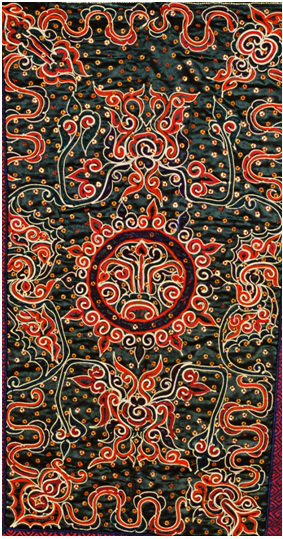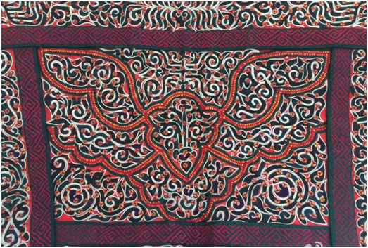 而在背兒帶下部的中心圖案則是一個(gè)古老的傳統(tǒng)紋樣。主體形象以同心圓為主,里面的幾何裝飾圖案依次向外擴(kuò)散,就像太陽(yáng)的光芒一樣向四周散射。圓是一個(gè)太陽(yáng),里面有一棵樹,即小孩的生命樹,寓意生命之樹長(zhǎng)青,樹上有一顆石榴花,寓意多子。太陽(yáng)周圍彩帶狀紋樣代表雷鳴與閃電。雷神的地位在水族社會(huì)中是至高無(wú)上的,能主持正義、懲惡揚(yáng)善。背兒帶上繡雷鳴便是祈求雷神對(duì)幼兒的庇佑。太陽(yáng)紋與雷神的象征圖案組合,是水族自然神崇拜信仰的寫照。太陽(yáng)圖案上下繡有兩只大蝴蝶,左右各繡一只老鷹。下部的四角是葫蘆紋,葫蘆的形象源于水族的創(chuàng)世神話。天地初始之時(shí)洪水泛濫,作為水族先人的兄妹二人為了躲避洪水,棲身于一支大葫蘆中,直至洪水退去。兄妹二人走出葫蘆,結(jié)為夫妻,繁衍生息,才有了今日成千上萬(wàn)的水族兒女。于是,葫蘆被賦予了繁衍、生殖的意義。