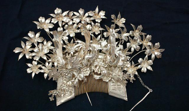 銀鳳冠和銀花帽是頭飾中的主要飾品,也是整套銀飾系列之首,素有龍頭鳳尾之美稱,其制作較為復(fù)雜,使用的小件飾品少則一百五十余件,多則達(dá)兩百余件,價(jià)值昂貴。苗族銀飾,如同苗族刺繡、織錦、蠟染等裝飾物一樣,是苗族支系相互區(qū)別的重要表征,不同地域的銀飾有著不同的特征。