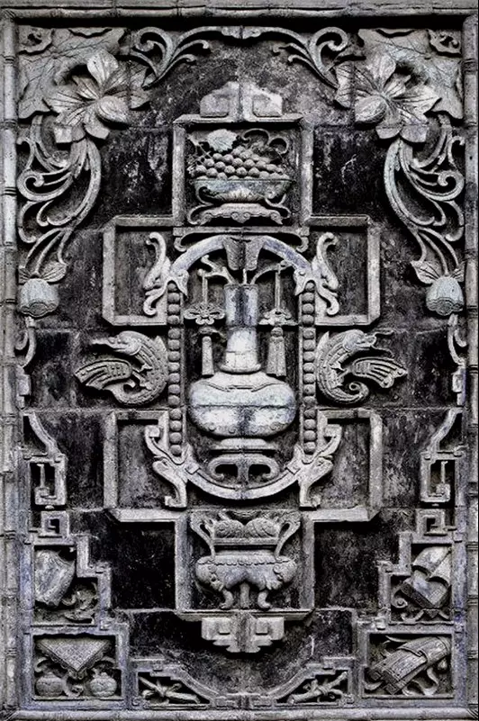 磚雕指在青磚上雕出山水、花卉、人物等圖案,是古建筑雕刻中很重要的一種藝術(shù)形式。