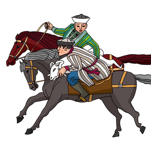 柯?tīng)柨俗巫?馬上角力):柯?tīng)柨俗巫逵?41549人,聚居在新疆克孜勒蘇柯?tīng)柨俗巫灾沃?。柯?tīng)柨俗巫逯饕w育項(xiàng)目有賽馬、刁羊、摔跤、馬上角力、跑馬拾銀元、跑馬射元寶、月下尋物等。