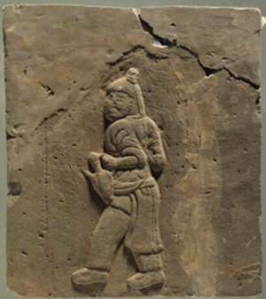 長30厘米,寬26.8厘米,厚5厘米。畫面中央為一男仆手持壺作行進(jìn)狀。男仆頭戴幘巾,身著翻領(lǐng)長袍,雙袖卷起至肘部,前襟卷起掖于腰帶上,左手持有蓋長柄執(zhí)壺,穿長褲,足穿靸鞋,上身前傾,似乎聽到主人的呼喚,正在匆忙前去斟酒服侍,整體畫面形象生動。