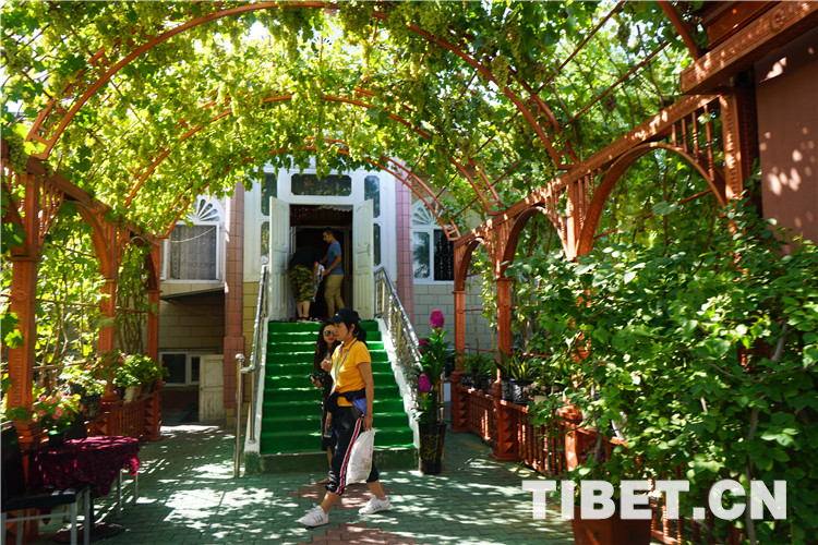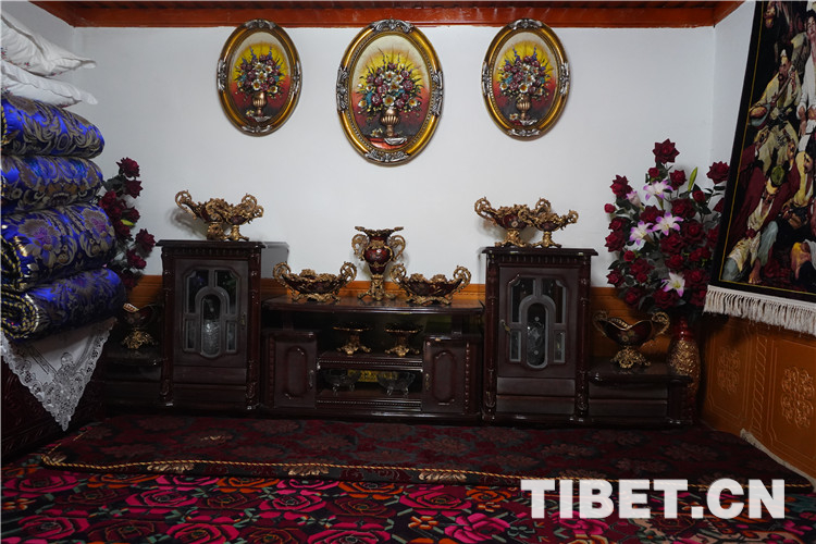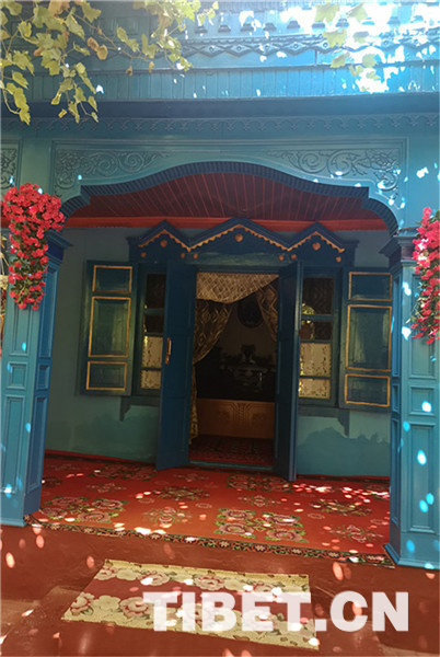 除了古老的純木質(zhì)結(jié)構(gòu)民宿,喀贊其還有各式磚石結(jié)構(gòu)的民居。院落寬敞明亮、華麗氣派,家家種植著花草、蔬菜,郁郁蔥蔥、生機盎然,葡萄廊架已成為每家的“標配”,葡萄架下是家人休閑、朋友聚會的地方。圖為當?shù)孛窬釉簝?nèi)。