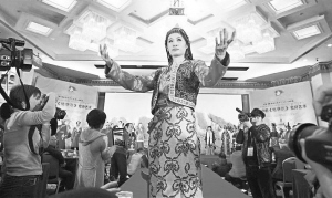 2012年12月,由全國《格薩(斯)爾》工作領(lǐng)導小組辦公室、青海省《格薩爾》工作領(lǐng)導小組辦公室等聯(lián)合主辦的中國·青海·果洛《格薩爾》藝人成果展暨圓光中的《格薩爾》史詩藝術(shù)展在北京舉行。圖為開幕式上模特在展示《格薩爾》史詩中所描述的民族傳統(tǒng)服裝。 資料圖片
