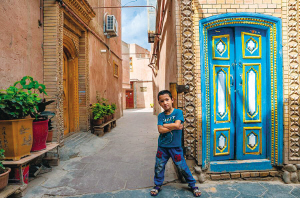 江庫爾干巷最美的門,人們都愛在此留影。上午12點,斑駁的陽光灑在門上,瓦力小朋友跳到鏡頭前學(xué)著電影中的人物姿勢,讓我給他拍照片。
