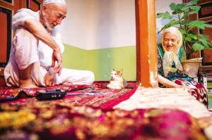 20多年前的喀什古城,老舊巷道縱橫交織,衛(wèi)生狀況較差,一些大膽的老鼠不論白天黑夜在巷道里亂竄,很多人家養(yǎng)貓是為了對付老鼠。如今走在改建后的古城里,所到之處窗明幾凈,而這里的貓從捕鼠者變?yōu)榧彝櫸?。貓已適應(yīng)角色轉(zhuǎn)變,愜意地享受著暖暖的羊毛毯。老兩口對寵物貓像對自家的孩子一樣呵護備至。