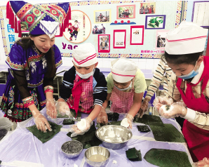 廣西南寧市南師附小把民族團結(jié)教育融入日常教學(xué)中。圖為老師和同學(xué)們一起制作傳統(tǒng)美食。叢蓉攝
