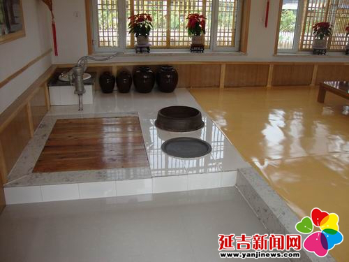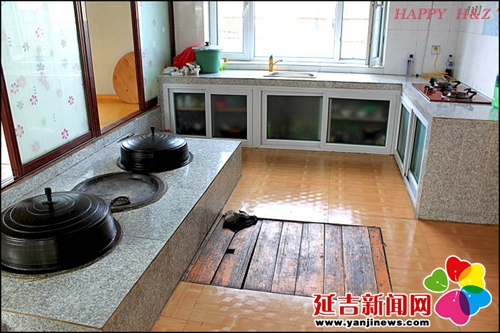 在傳統(tǒng)的朝鮮族民宅中,炕和鍋臺(tái)是平齊的,需要燒火做飯時(shí),主婦會(huì)打開架在柜臺(tái)一側(cè)的移動(dòng)木板,下到地面水平線以下的“灶坑”點(diǎn)火做飯。傳統(tǒng)的炕采用長筒式結(jié)構(gòu),煙火由一洞內(nèi)循環(huán)排出,使每洞都有煙火串入,炕即溫?zé)帷3r族的火坑高度為30-40厘米,但炕洞向下挖入,炕面抹白灰,表面糊油紙或鋪草簾子,炕面平整。隨著物質(zhì)條件的改善,炕面改鋪纖維板或者地板膠,既美觀又耐用。
