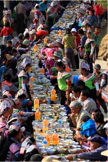 節(jié)日期間,哈尼寨子擺起長街宴,哈尼語叫“姿八多”,意為“互相輪流著敬酒”。小寨子擺一次,吃一天,大寨子則要擺兩三次,吃兩三天。每戶做一桌酒菜,抬到寨子街道上擺好,一戶接一戶沿著街道擺成長街宴,八個或十個人自愿結(jié)合為一桌暢飲。大寨子分片輪流做東,負(fù)責(zé)長街宴的酒菜,其他片的人做食客,從早吃到晚,場面十分熱鬧。