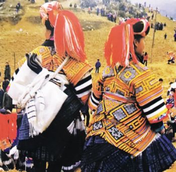 要論“疊穿”的數(shù)量之最,則當(dāng)屬貴州大方縣顯母村的苗族女性了。與苗族慣用銀飾的固有印象不同,這里的苗族女性鮮以銀為飾,她們用數(shù)量極為可觀的服飾“疊穿”來彰顯富裕。節(jié)日里,顯母村的苗族女性換上盛裝——數(shù)條百褶裙系在腰間,塑造出豐腴的臀部造型,內(nèi)層裙子素凈無花,外層裙子則布滿條帶狀蠟染裝飾。在這個(gè)難得的大型社交場合,未婚女孩通過“疊穿”后的獨(dú)特造型來展示自己的魅力,衣物的數(shù)量和精致程度成為了吸引異性、獲得肯定的重要標(biāo)準(zhǔn)和獲得美好婚姻的重要條件。到了婚禮時(shí),女性所著裙子的數(shù)量更是可達(dá)35條?;楹?,她們要在裙邊加上一圈深色邊飾以作標(biāo)識。