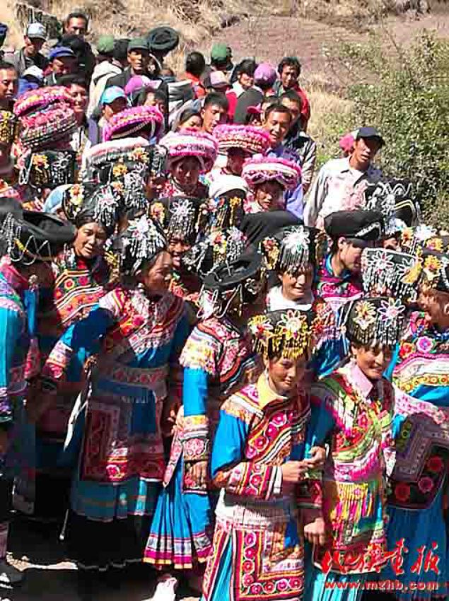 娶親要請(qǐng)客,當(dāng)?shù)乩圩逭?qǐng)客只需口頭傳話,凡是知道的親戚朋友都會(huì)來(lái)參加。娶親隊(duì)伍主次兩位主婚人,伴郎伴娘各一人,背新娘和嫁妝的二人,接親的四至六人,其中有一至兩個(gè)歌手,一行十二人組成。帶著早已為新娘準(zhǔn)備好的花短衣、長(zhǎng)裙、銀手飾、圍腰鏈、銀泡、銀項(xiàng)等飾物興高采烈地從新郎家出發(fā)。