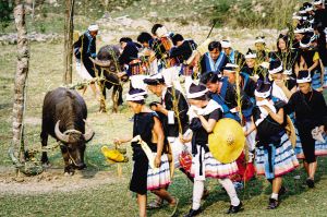 白褲瑤的喪葬習(xí)俗十分獨(dú)特,整個葬禮悲壯、肅穆,氣氛凝重莊嚴(yán)。參加葬禮的親友依次排隊(duì)順時針繞牛一圈,緬懷逝去的親人。2007年10月拍攝。