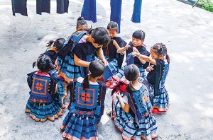 南丹縣瑤族服飾代表性傳承人黎鳳珍在染坊免費(fèi)教授前來學(xué)習(xí)的小學(xué)生。2018年拍攝。