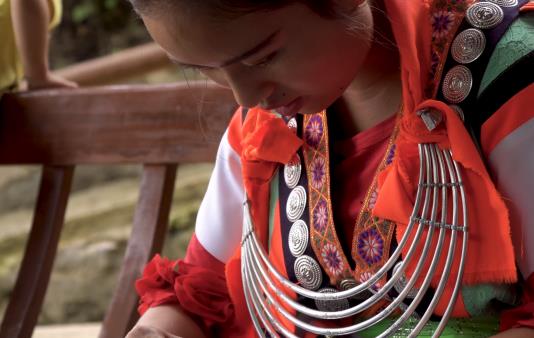 谷灑村苗族服飾上的圖案,呈現(xiàn)多元化的風(fēng)格,這是因為苗族女子的服飾往往都出自她們自己的手中,每件服飾都有著個人風(fēng)格。谷灑村苗族喜歡在古井的涼亭上刺繡,這里涼風(fēng)習(xí)習(xí),是她們納涼刺繡最好不過的地方。同伴坐在一起,這樣以便于互相指點,學(xué)習(xí)對方的長處、彌補自己的短處。