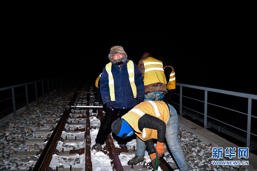 1月11日,在青藏鐵路望昆站,于本蕃檢查鐵軌。(新華社記者張龍 攝影)