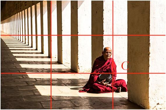 這三張圖都是就是黃金交叉點(diǎn)構(gòu)圖的應(yīng)用,第三張是在緬甸的拍的,當(dāng)時(shí)這個(gè)僧人坐在有光的長廊里,他的頭不在交叉點(diǎn)上,但落在相對差不多的位置。