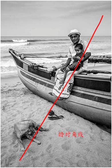 這個(gè)海邊老人跟狗之間也形成了暗對角線,包括下面的這個(gè)在拍照的人跟這個(gè)雕塑之間也形成了一個(gè)暗對角線,所以這個(gè)畫面非常平衡,不是一邊重一邊輕,而且不呆板。所以對角線這種形式非常實(shí)用。