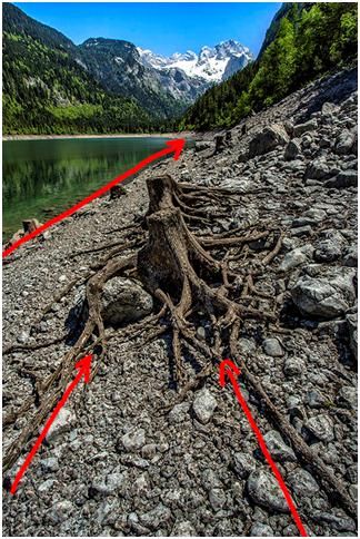 這個(gè)片子的興趣點(diǎn)是樹樁,樹樁根系和湖岸形成的引導(dǎo)線,把我們的目光從樹樁根系一直在往前推,一點(diǎn)點(diǎn)推到雪山,并不是跳躍性的看到雪山。觀者進(jìn)入畫面是一個(gè)逐步的過程,是一直有引導(dǎo)線引導(dǎo)著你,最后看向了遠(yuǎn)處的森林和雪山。