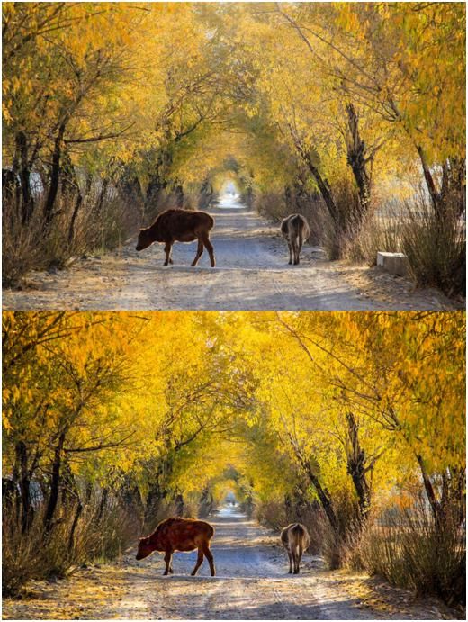 我們將遠(yuǎn)處部分的高光壓低,提亮了一下黃色的樹葉和地面的光照,加強(qiáng)了地面的陰影,這樣就有了一個(gè)比較通透明快的感覺,空間的縱深效果也有了加強(qiáng)。另外也稍微提亮了牛身上的亮度,但不能提的太亮,因?yàn)檫@樣的話會使片子的噪點(diǎn)比較大,同時(shí)也會失色。