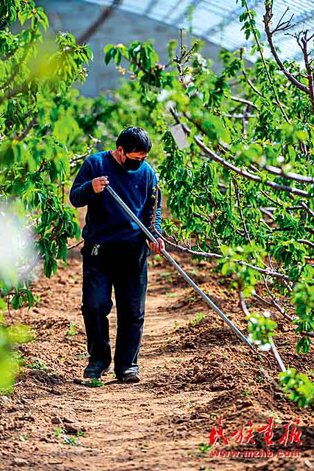 2020年3月,洪浩爾敖包村的貧困戶(hù)李玉山在大棚里給櫻桃樹(shù)鋤草。(新華社 供圖)