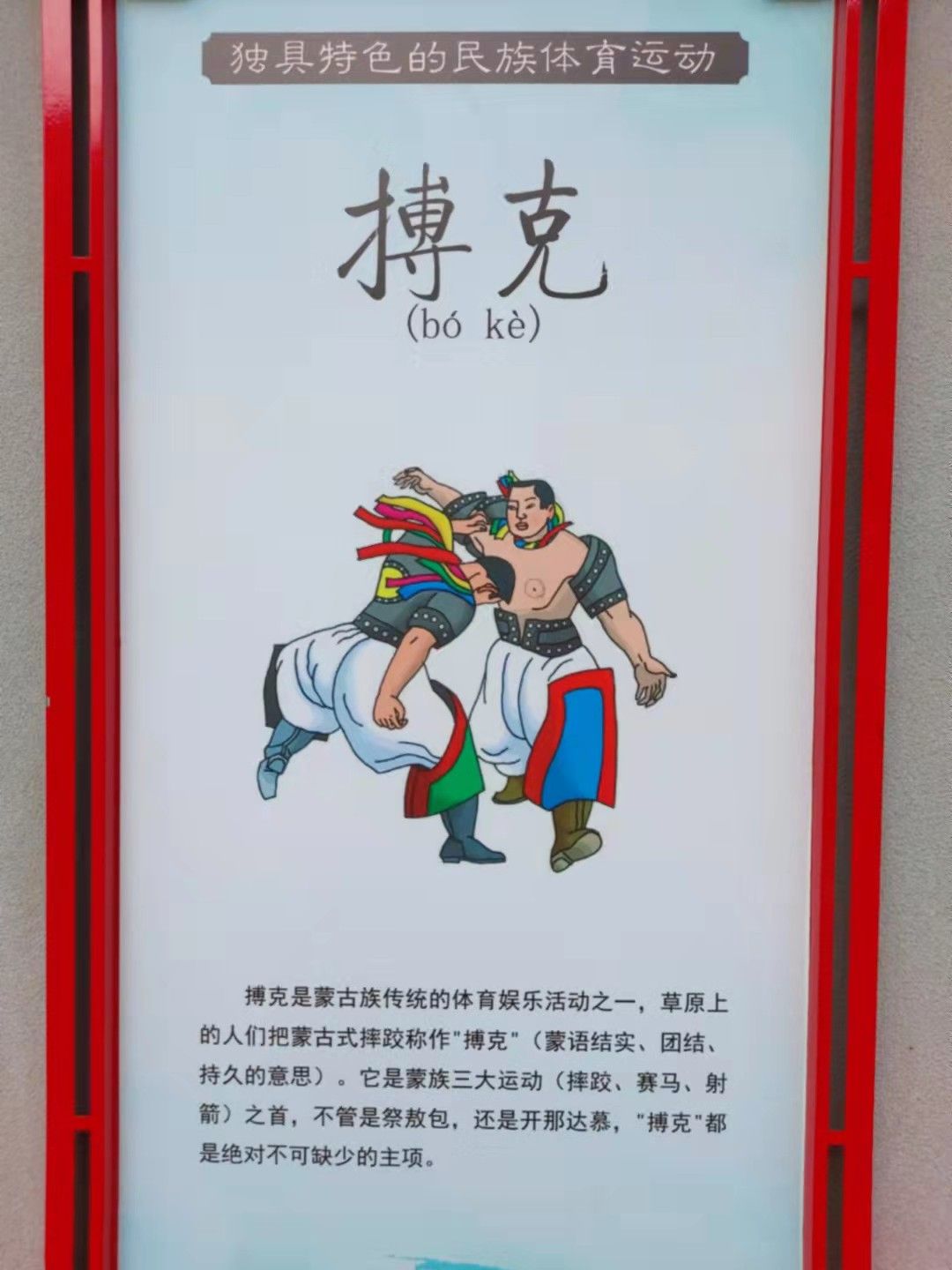 搏克是蒙古族傳統(tǒng)的體育娛樂活動(dòng)之一,草原上的人們把蒙古式摔跤稱作"搏克”(蒙語結(jié)實(shí)、團(tuán)結(jié)、持久的意思) .它是蒙族三大運(yùn)動(dòng)(摔跤、賽馬、射箭)之首,不管是祭敖包,還是開那達(dá)慕,"搏克"都是絕對不可缺少的主項(xiàng)。