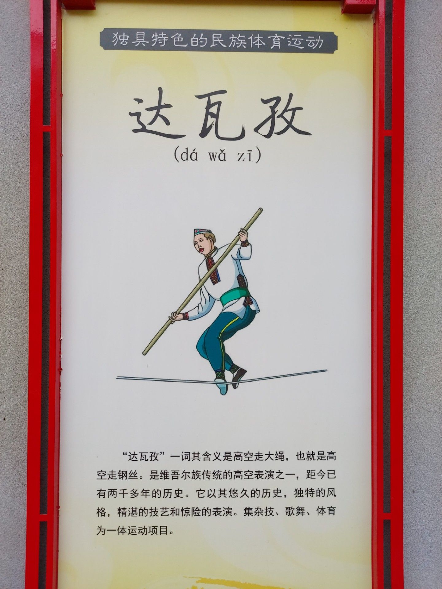 “達(dá)瓦孜”一詞其含義是高空走大繩,也就是高空走鋼絲。是維吾爾族傳統(tǒng)的高空表演之一,距今已有兩千多年的歷史。它以其悠久的歷史,獨(dú)特的風(fēng)格,精湛的技藝和驚險的表演。集雜技、歌舞、體育為一體運(yùn)動項目。