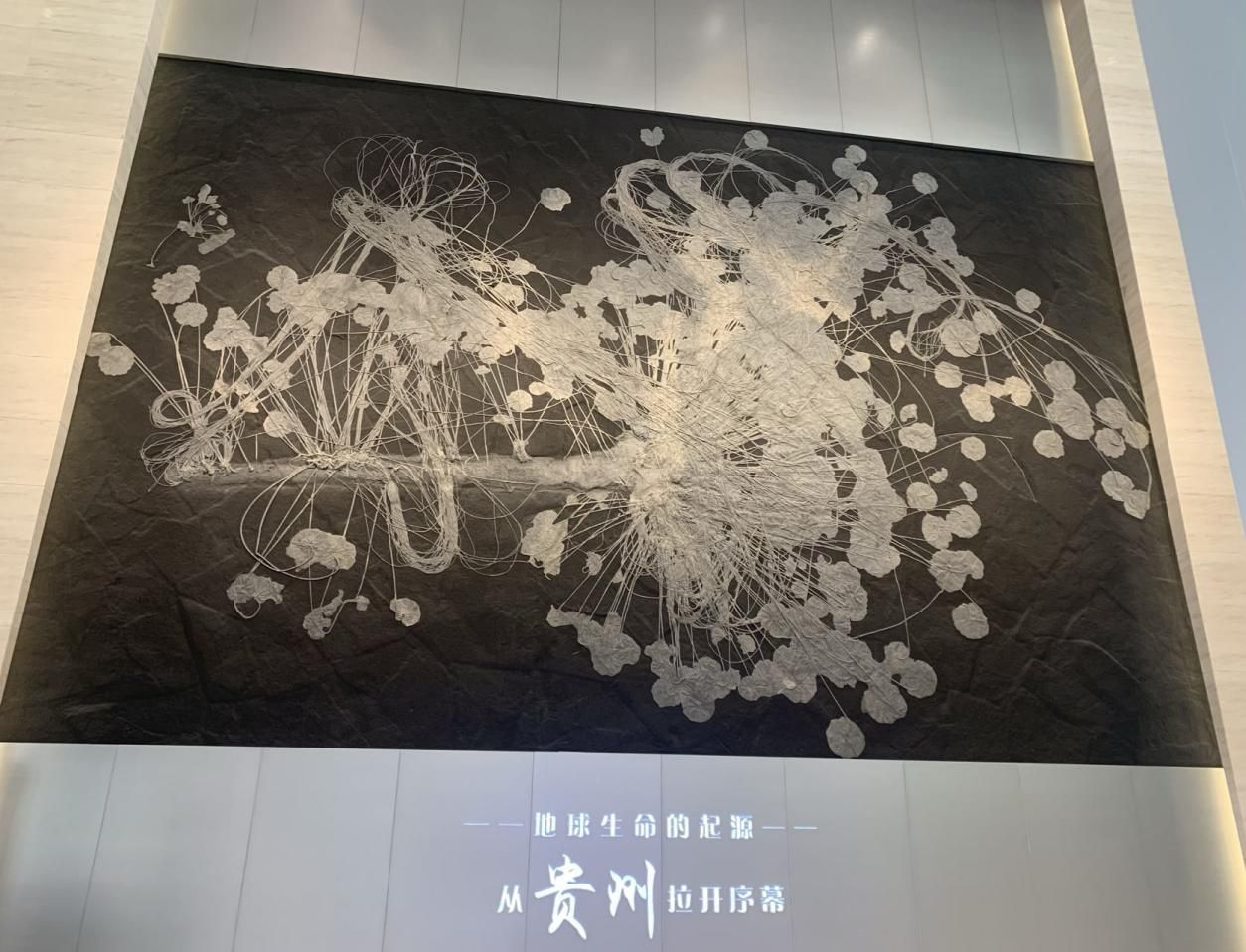 走進序廳,左側(cè)墻面的巨幅海百合化石,格外引人注目。這幅關(guān)嶺創(chuàng)孔海百合,是目前已知自然產(chǎn)出面積最大、保存最精美的海百合生態(tài)化石標本,長12.5米,寬8.2米,面積高達102.5平方米,重約2.5噸,由一大、一小兩組完整的海百合假浮游生態(tài)群落組成。