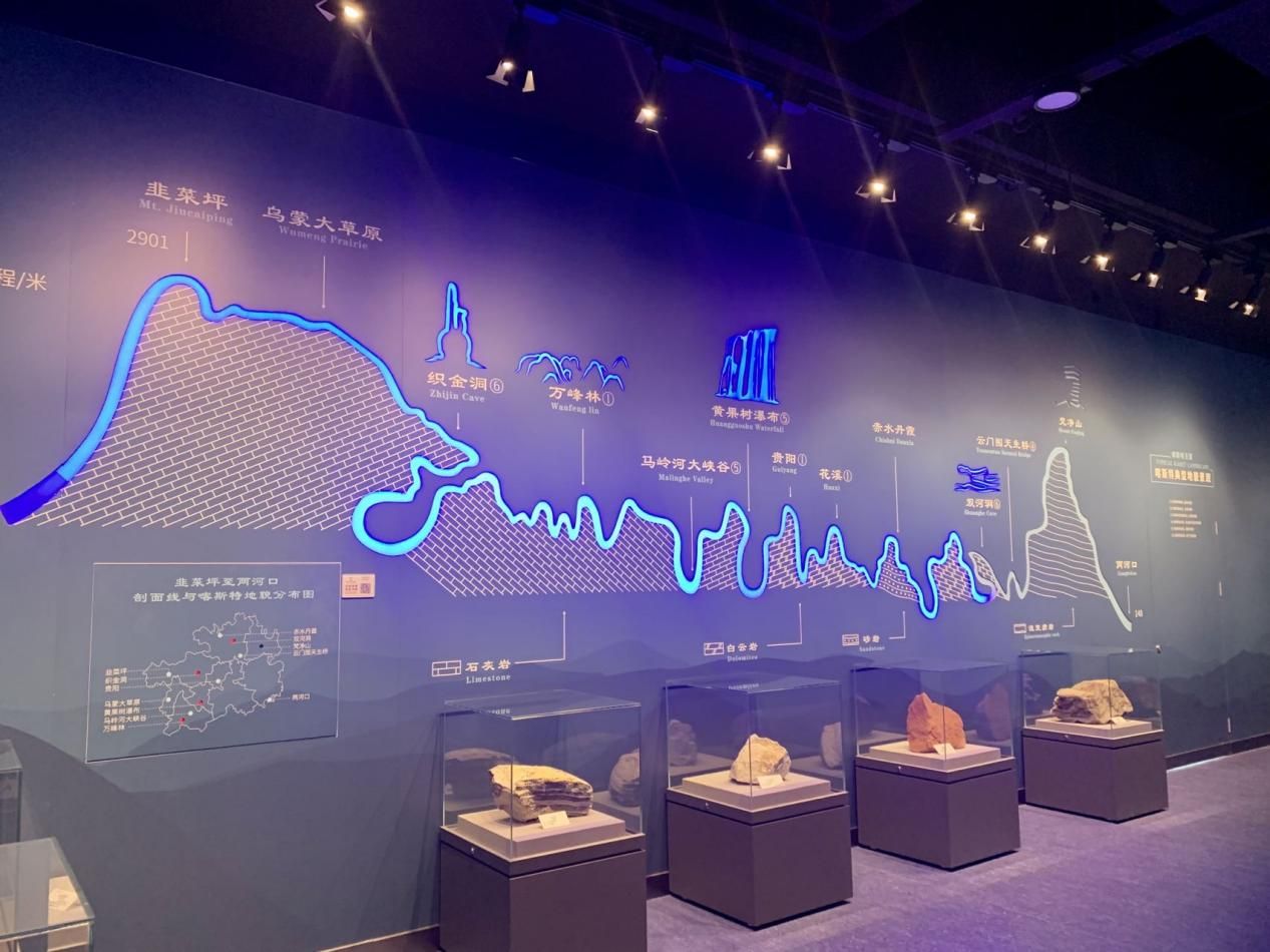 “多彩貴州”展廳以“喀斯特王國”為主題,分為“滄海變遷”“追根溯源”“經(jīng)典地貌”“地質(zhì)旅游”四個部分,運用聲光電、場景復原、油畫、沙盤等展示手段,再現(xiàn)貴州“喀斯特王國”的各類地質(zhì)景觀,大自然的鬼斧神工。