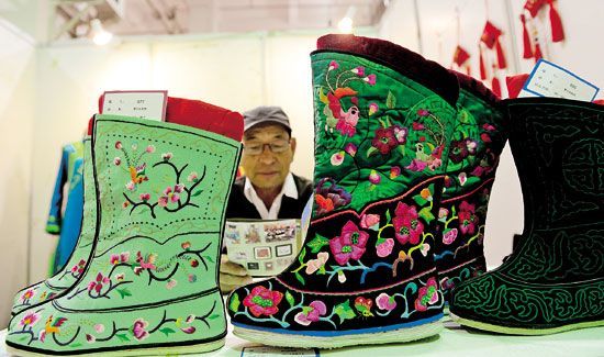 傳統(tǒng)的氈繡工藝品包括吉祥圖案、花紋圖案、五畜圖案、鮮花飛鳥、蒙古包門、氈包帡幪、馬鞍屜、氈靴(氈襪)、坐墊、各種繡花氈囊、拾羔袋、駝鞍等。