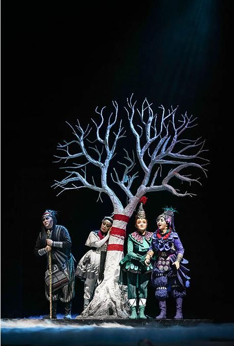 歌劇《小河淌水》在舞美、服裝、燈光,特別是音響方面都有其特色與成功之處。劇中并沒(méi)有追求奢華的舞美,而是以簡(jiǎn)潔與流暢的方式彰顯了民族特色,取得了較好的藝術(shù)效果。