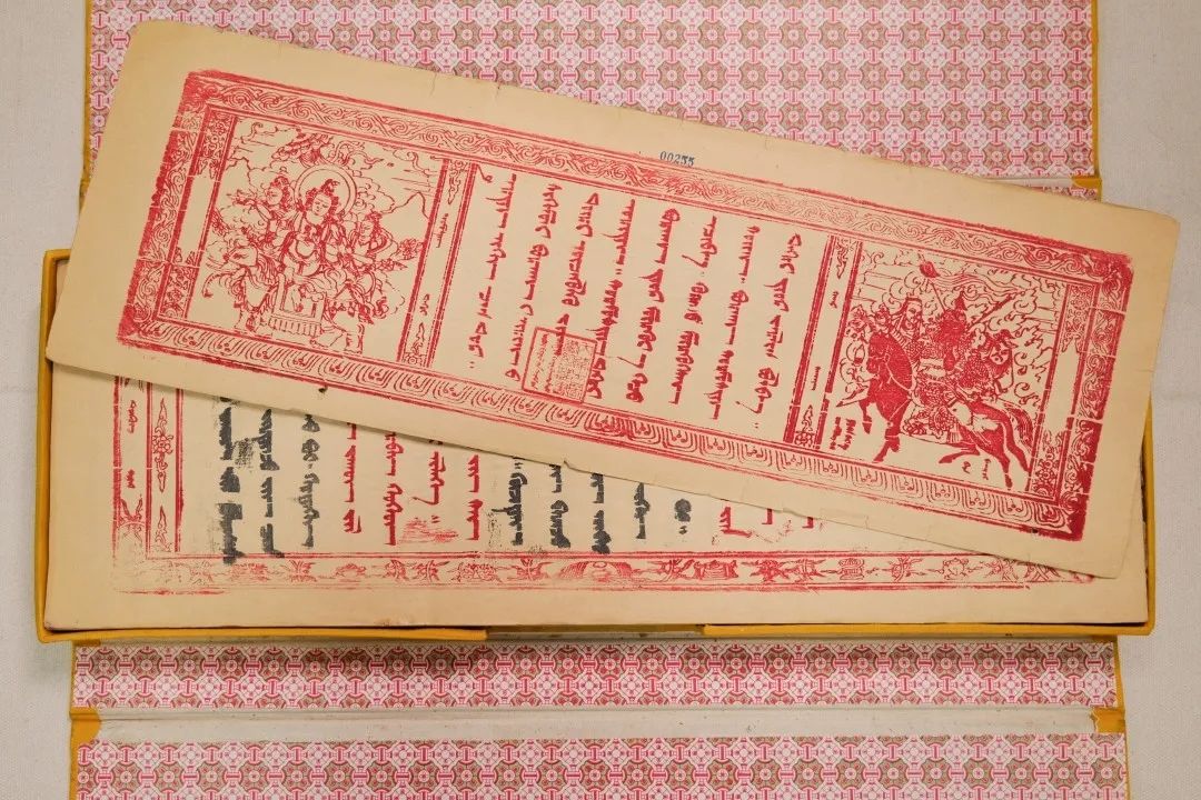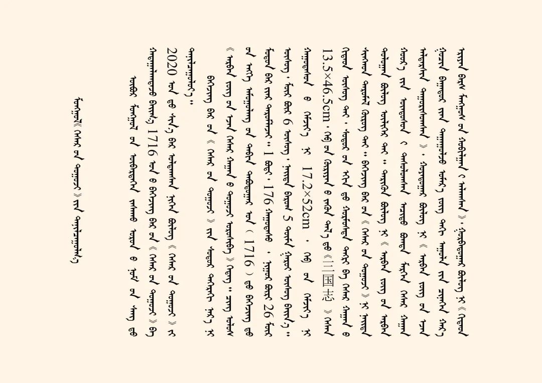 今天我們主要講述的是1716年北京木刻本蒙古文《格斯爾傳》(全稱為《十方圣主格斯爾可汗傳》)是清康熙五十五年(1716)北京木刻本。梵夾裝,1卷(176葉),每頁26行,每行6個字,約5萬多字,頁面高17.2cm、寬52cm,版框高13.5cm、寬46.5cm。版框左側(cè)有漢文《三國志》三字,首頁刻有朱印佛像。