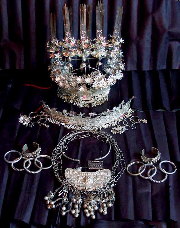 據(jù)苗族古歌傳唱,早期的苗族銀飾以胸飾、手飾為主,其中胸飾由冷兵器時代的護心鏡演變而來,手鐲最初是巫術(shù)中的兒童辟邪之物。后來,由于不同苗族支系文化的相互滲透,用于服飾裝扮的內(nèi)容和形式逐漸豐富,遂演變成現(xiàn)在豐富多彩的苗族銀飾。