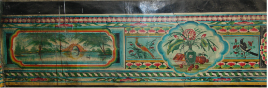 達(dá)拉特旗地區(qū)的墻圍畫高度一般在70厘米左右,其長(zhǎng)度則依炕的大小而定??簧喜糠值漠嬍侵黧w,在結(jié)構(gòu)上有一套固定的模式,即以上下兩組邊道,按照一定的規(guī)格布置形成主體框架,中間等距離安排各種畫空,既具完整對(duì)稱的裝飾形式美感,又具簡(jiǎn)繁對(duì)比、主從相映的豐富表現(xiàn)內(nèi)涵。邊道圖案種類繁多,有折子邊、卷帶邊、竹筒邊、花邊等。畫空也稱“池子”,有正方形、長(zhǎng)方形、扇形、圓形等多種形式。此外,在下邊道與炕距離25-30厘米的范圍內(nèi)是黃顏色的邊子,這樣的設(shè)計(jì)是避免炕上物件的遮擋和抬高人的視線,便于觀賞。