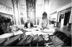圖為蠟染非遺工坊的設(shè)計師們正在設(shè)計蠟染產(chǎn)品。