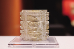 位于浙江杭州余杭區(qū)的良渚遺址,是考古實證中華文明史的典范。良渚文化玉器發(fā)達,玉琮和玉璧是其重要代表。展覽中的這件玉琮出土于反山遺址12號墓,內(nèi)圓外方,器型規(guī)整,共有三節(jié),雕刻簡化的神人獸面紋,紋飾類似后世青銅器“三層花紋”,制作工藝已使用拉絲、管鉆、鋸切等技術,減地淺浮雕手法,滿密的陰線刻,精細的器表打磨剖光技術,均表現(xiàn)了良渚玉器的高度成就。
