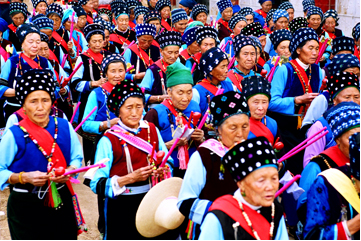 以太邑、云龍、洱源為主要代表的山區(qū)白族服飾。生活在山區(qū)的白族,對(duì)山區(qū)自然條件生存依賴性較強(qiáng),如太邑白族婦女服飾,婦女的頭飾較為簡(jiǎn)單,整個(gè)包頭用一塊一丈二尺長(zhǎng)的黑布在頭上纏繞成筒狀,然后在呈筒狀的黑色包頭正前端鑲一個(gè)用黑色硬布制作的三角形飾物作帽正,三角形飾物上釘滿小銀泡,并在頂端鑲一顆紅色流璃珠作點(diǎn)綴,整頂頭飾盡顯簡(jiǎn)樸之美。從頭飾的特征來看,其受彝族文化影響較深,在色彩和質(zhì)地上與壩區(qū)白族頭飾有很大的區(qū)別,山區(qū)白族頭飾厚重,壩區(qū)白族頭飾輕盈而飄逸。