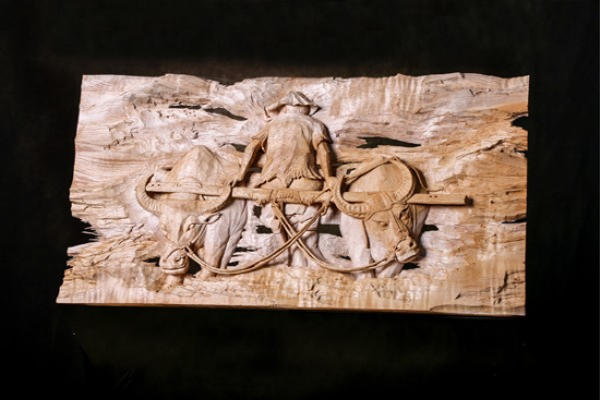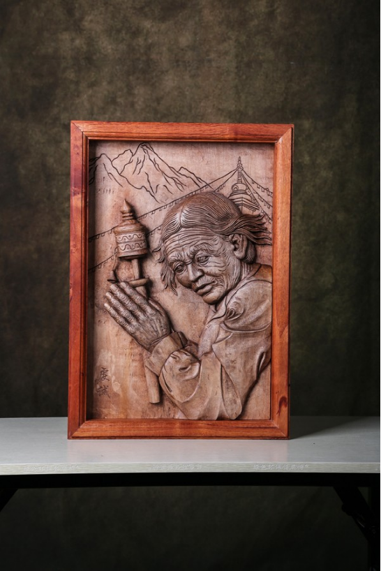 《門(mén)神》、《福滿(mǎn)門(mén)》這是劍川木雕在繼承傳統(tǒng)基礎(chǔ)上,對(duì)傳統(tǒng)的一種大膽嘗試性的發(fā)揚(yáng)創(chuàng)作。這些作品的特點(diǎn)是,既保留了嫻熟的傳統(tǒng)木雕技藝,只是通過(guò)巧妙的組合,在現(xiàn)成的古老大門(mén)上雕出“門(mén)神”或用舊門(mén)框作為木雕作品的邊框,從而產(chǎn)生一種新的意趣,這種創(chuàng)意很適合當(dāng)下都市的審美要求,也是劍川木雕未來(lái)發(fā)展中很值得提倡的新思路。木雕復(fù)制《張勝溫畫(huà)卷》