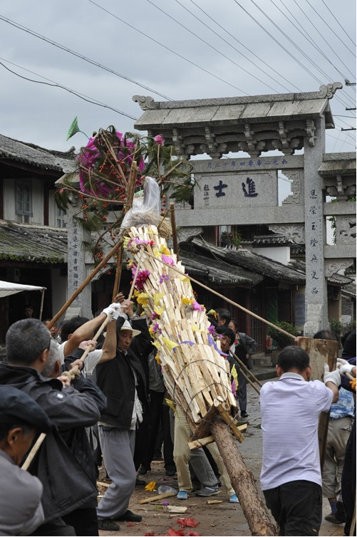 在劍川,都是由家里喜添子嗣的人家來籌備火把節(jié)的一切事宜,除了對新生兒的祝福,火把樹的裝扮也表示劍川人祈愿風(fēng)調(diào)雨順,人壽年豐、鄰里和諧。火把要扎十二層(閏年要扎十三層),上面六層的明子和柴分別由細(xì)到粗,一層接著一層,下面七層都是一樣的新柴。喻示每一個(gè)新的日子都紅紅火火。