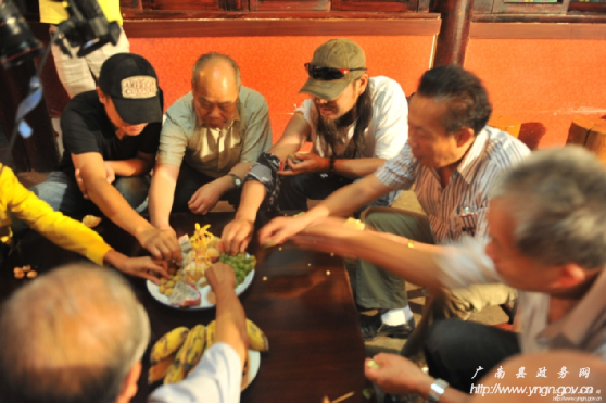 西行音樂(lè)公路之旅在享用土司盛宴——“三滴水”后,劇組被壯民族創(chuàng)造的具有深厚民族文化貫穿其中的民族飲食文化所折服,被壯民族熱情好客的情緒所感染。西行音樂(lè)公路之旅執(zhí)行導(dǎo)演劉暢說(shuō),北京有滿漢全席,想不到在廣南這個(gè)地方也有壯族自己的“滿漢全席”,他說(shuō),我和我的小朋友們都驚呆了!