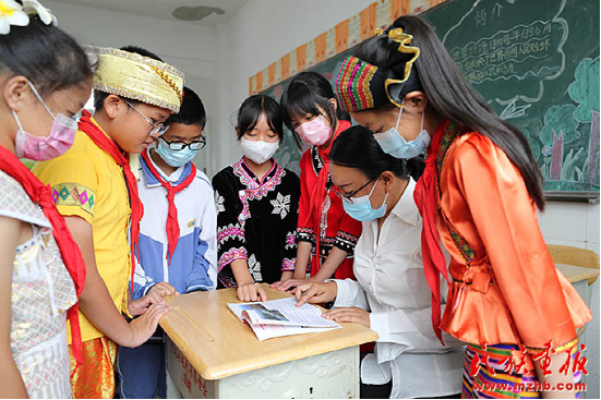 課間,老師為各族孩子們答疑解惑。