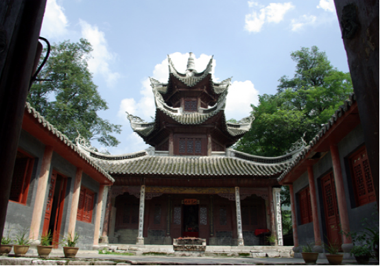冠山,位于貴州龍里冠山盆地(縣城)東隅,巖山形似金鐘撲地,古木參天,蔥郁蒼翠。明永樂七年(1409)始建的道教活動場所掩蔽其中,可謂“山不在高有仙則名”。在歷史的長河中,雖然道教一去不復(fù)返,但其紫虛觀主體建筑保存尚好,現(xiàn)列為省級文物保護單位,由主體建筑紫虛閣、左右?guī)?、前殿、山門、文昌祠組成二進院式古建筑群。主體建筑為木構(gòu)穿斗式三重檐六角攢尖筒瓦頂,1989年遷入的文昌祠,為木構(gòu)抬梁式歇山青瓦頂,帶吻正脊,戧脊翹角卷草,石質(zhì)柱礎(chǔ)浮雕仙草、竹、梅、鹿等圖案。西南兩面有1936年題刻的“還我河山”、“巨靈一孹”等七方摩崖石刻。建筑物的形制、布局給人一種古樸、滄桑之感。登閣騁目,遠山峻嶺和鱗次櫛比的樓房盡收眼底,讓人流連忘返。