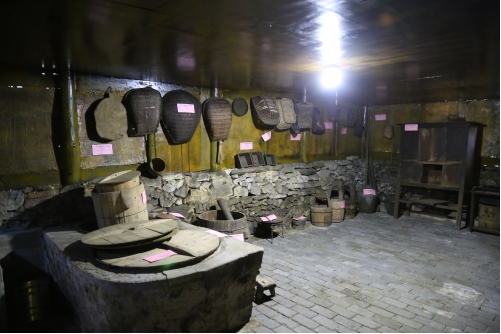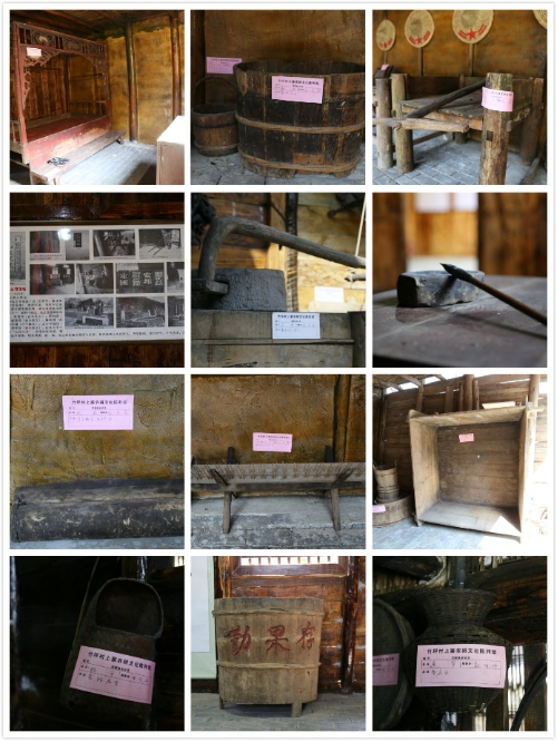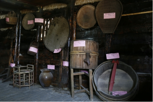 “農(nóng)耕文化陳列館”是由兩棟傳統(tǒng)的木質(zhì)民房改建,從大門進(jìn)來,門的兩邊放置有農(nóng)具,右側(cè)一個(gè)是存儲糧食的倉庫,沿著倉庫邊上的石階往上走,從小門進(jìn)去,大大小小的簸箕、飯甑、貓籮、魚籮等農(nóng)具應(yīng)有盡有。