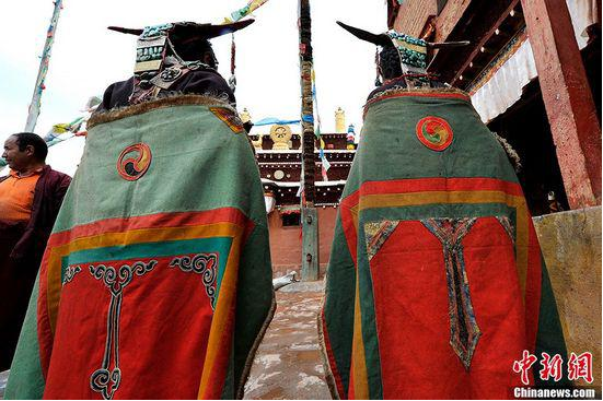 盡管歷史悠久,但它并沒有隨著時光的流逝和時代的變遷而被束之高閣,實際上,即便是今天,這些服飾仍然是當?shù)刂匾淖诮袒顒又斜夭豢缮俚膬?nèi)容,在科迦寺每年藏歷1月12日大譯師仁青桑布建成108座殿堂和寺廟的慶功紀念日上,科迦村有這套服飾的7戶家庭的婦女都要穿上這套服飾在科迦寺僧人跳神舞的間隙表演宣舞。