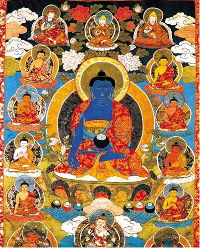 堆銹是青海塔爾寺獨(dú)創(chuàng)的一種藏族繪畫(huà)藝術(shù)形式,屬唐卡中的“國(guó)唐”。其制作特點(diǎn)是用各色質(zhì)地不同的綢緞綾羅剪出人物形狀和各種圖案形狀,然后在形象或圖案背后充塞羊毛、棉花等物,再逐一繡在黑色底子的大幅布幔上,使畫(huà)面產(chǎn)生出豐富而生動(dòng)的立體感和織物特有的肌理感,具有淺浮雕式的藝術(shù)效果。