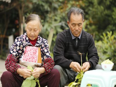 貴州貴陽苗族老年人與兒童剝玉米
