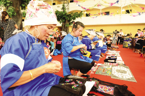 經(jīng)過層層選拔出的100名繡娘在此飛針走線,同秀技藝,展現(xiàn)了少數(shù)民族民間文化獨(dú)特的藝術(shù)魅力。